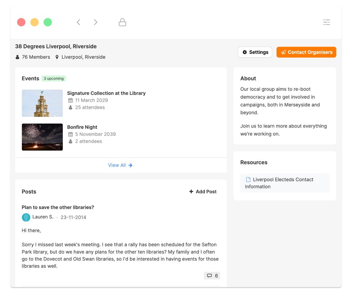 Within each group, members have access to a threaded forum. Group organizers help moderate the forum and can also organize group events and group petitions.