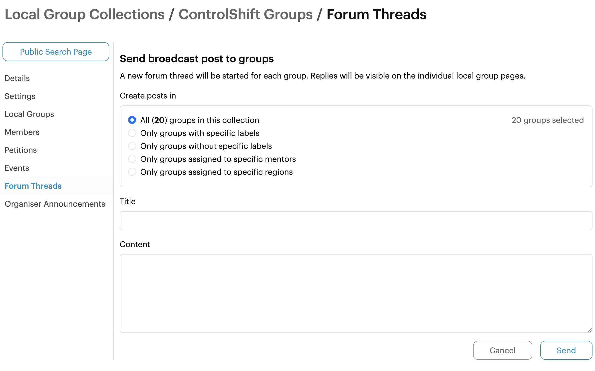 If an admin wants to post a message in all or many groups in the collection, they can use the broadcast post feature. This feature is available by going to the admin homepage > Local Groups > choose the appropriate collection > Forum Threads > Broadcast Post.