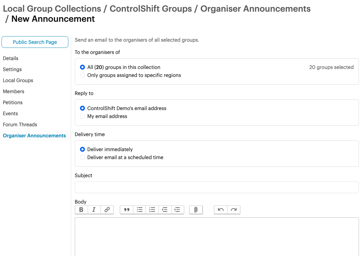 To get started sending an announcement to the group organizers, go to the admin homepage > Local Groups > choose the appropriate collection > Organizer Announcements > New Announcement.