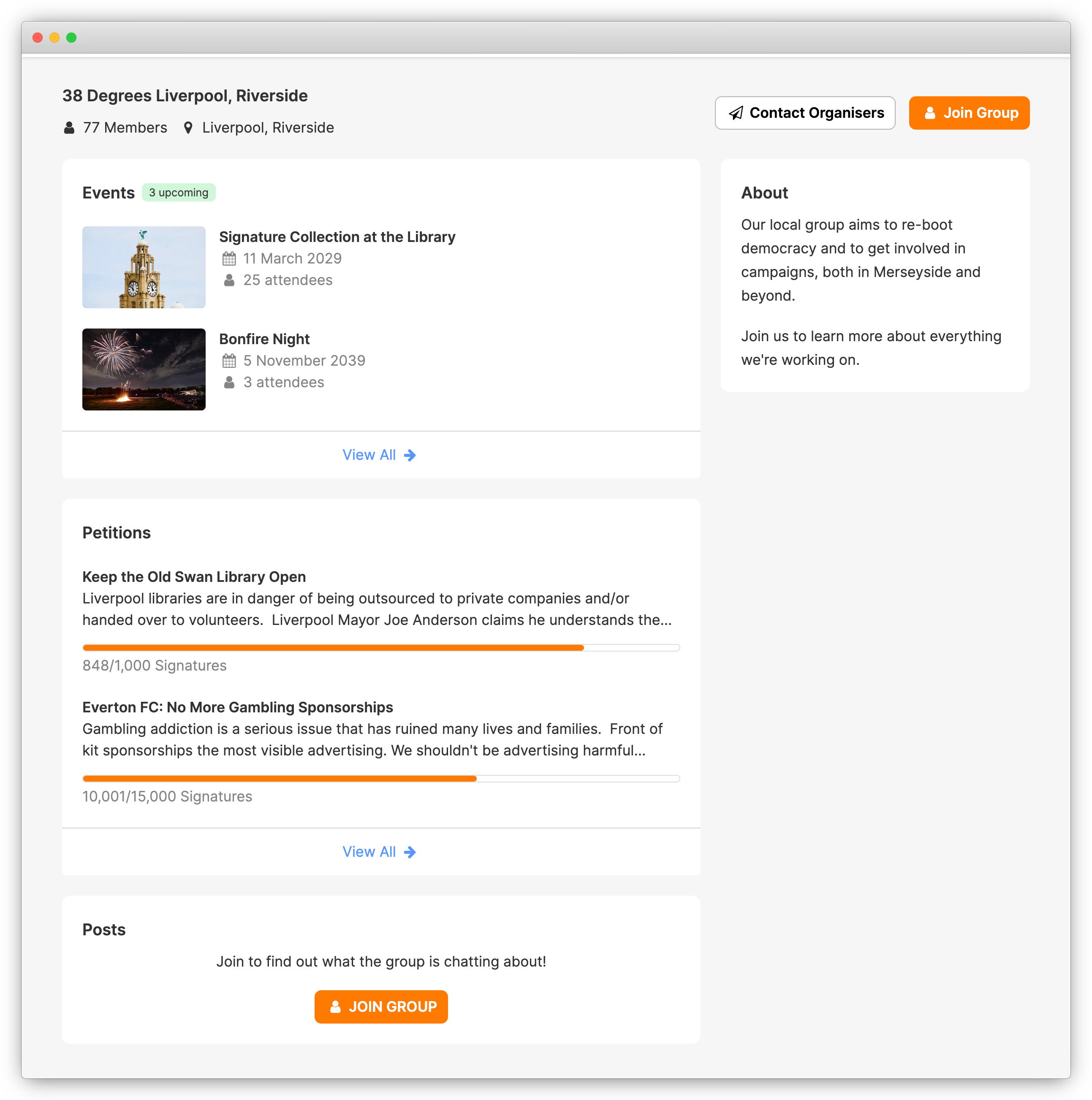 Open groups will show a "Join" button on their group front page. Also, users RSVPing to an open group's event will automatically be added as a "listening" member of the group – this means they'll receive updates from the group's forum even though they haven't fully joined the group.