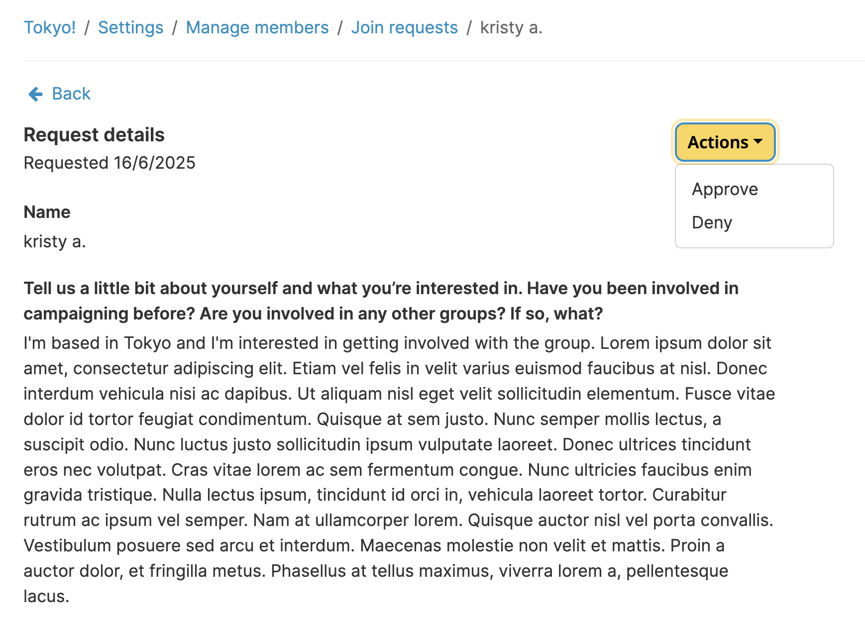 Clicking Review will show the prospective member's name and contact information (depending on the organization's privacy settings), the date they submitted their application, and their response to the membership question(s).